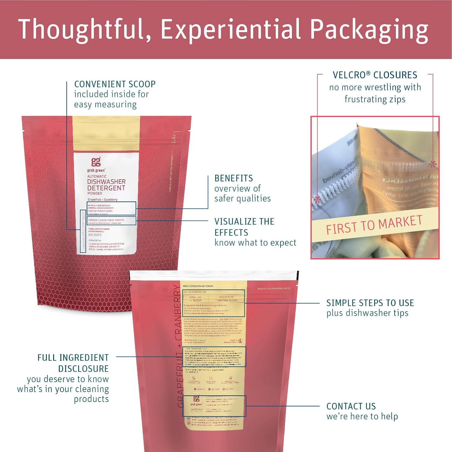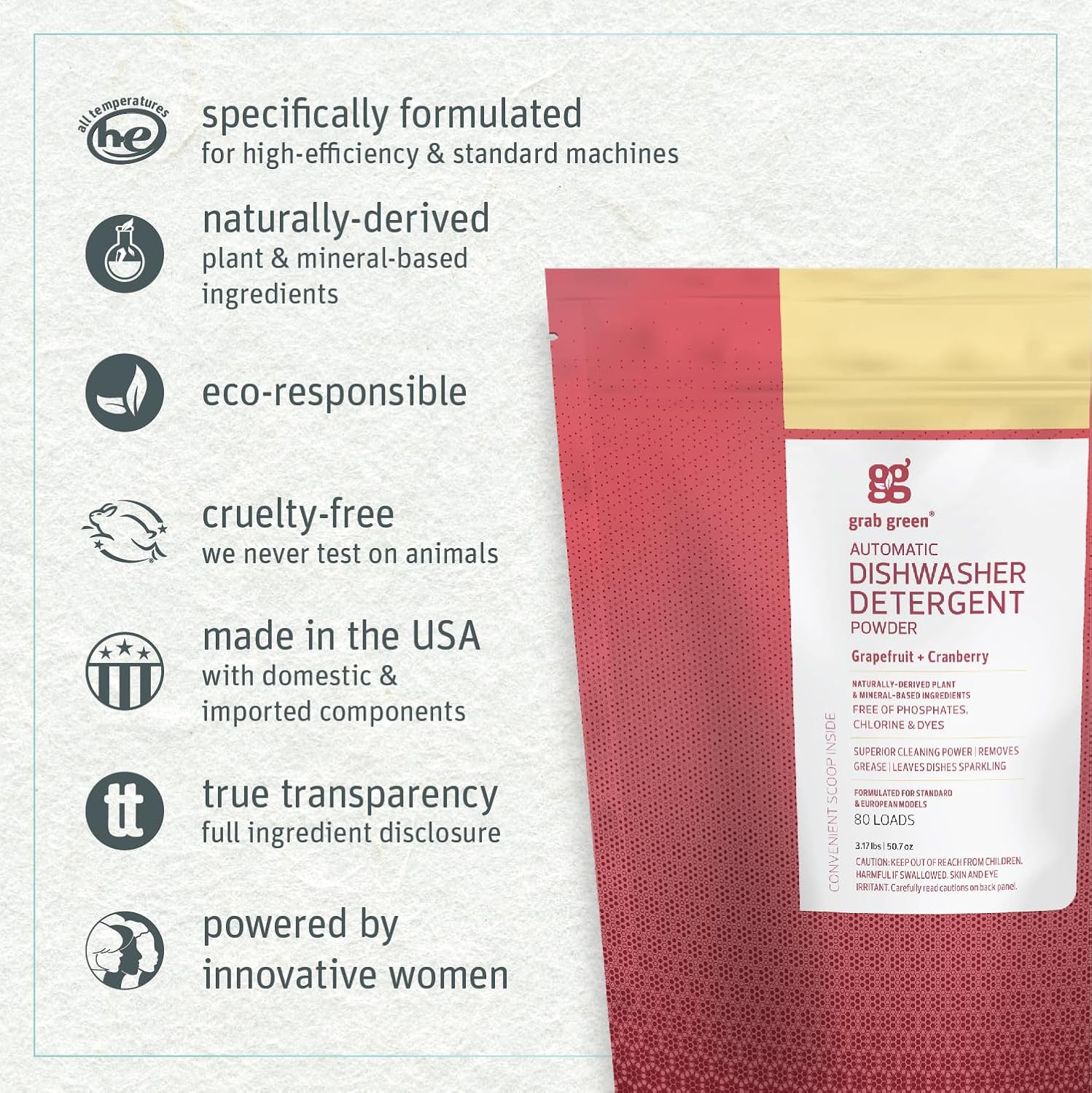 - Contains: 1- 3.17 Pound (80 Loads) Bag of Grab Green Natural Grapefruit with Cranberry Automatic Dishwashing Detergent Powder. Our velcro closure bags are convenient and easy to use, no hassling with frustrating zip closures