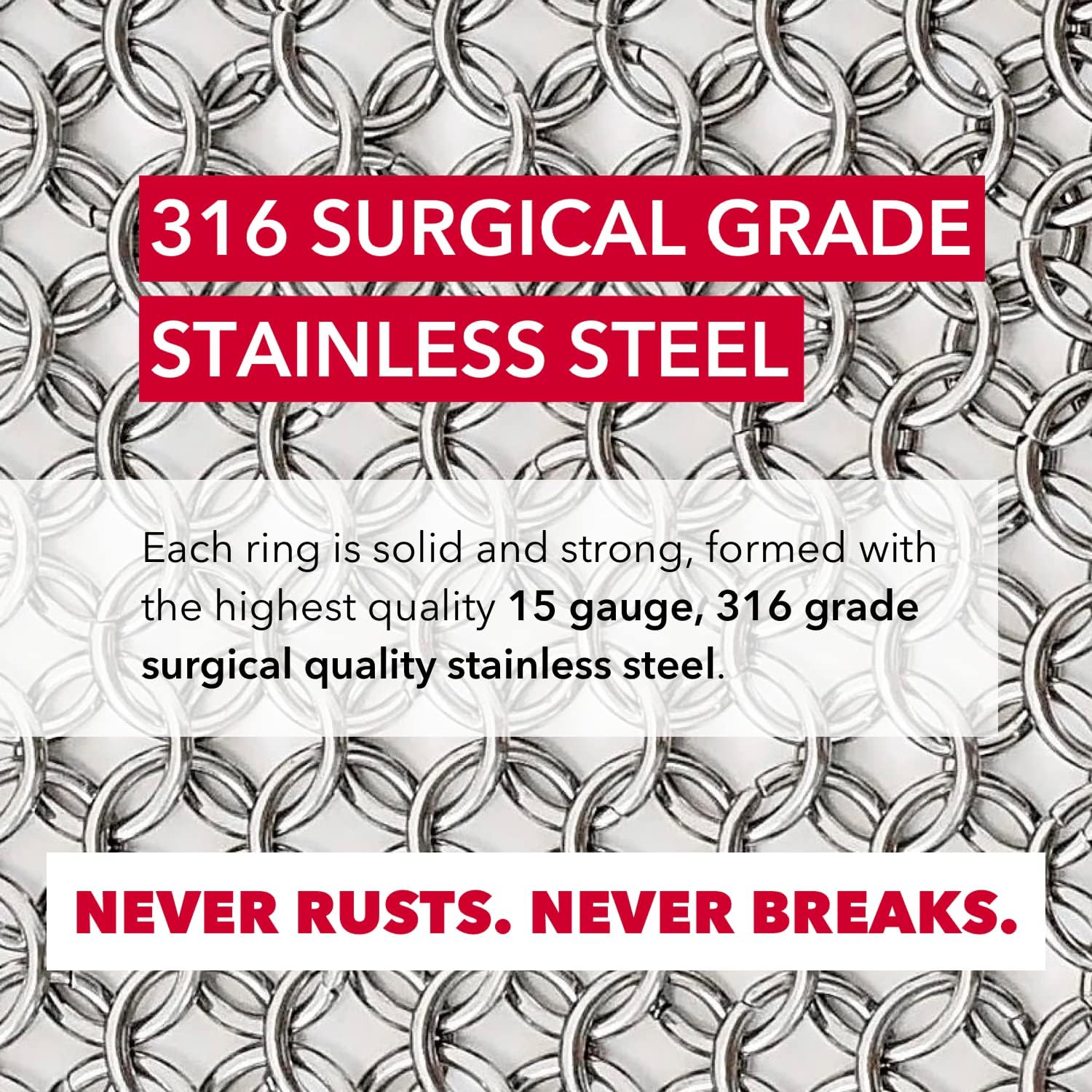 - EXTREME PRECISION AND CONTROL WITH 316 GRADE STAINLESS STEEL RINGS. With a larger surface area and smaller rings, you can confidently get into small grooves and corners with our chainmail scrubber for cast iron pans