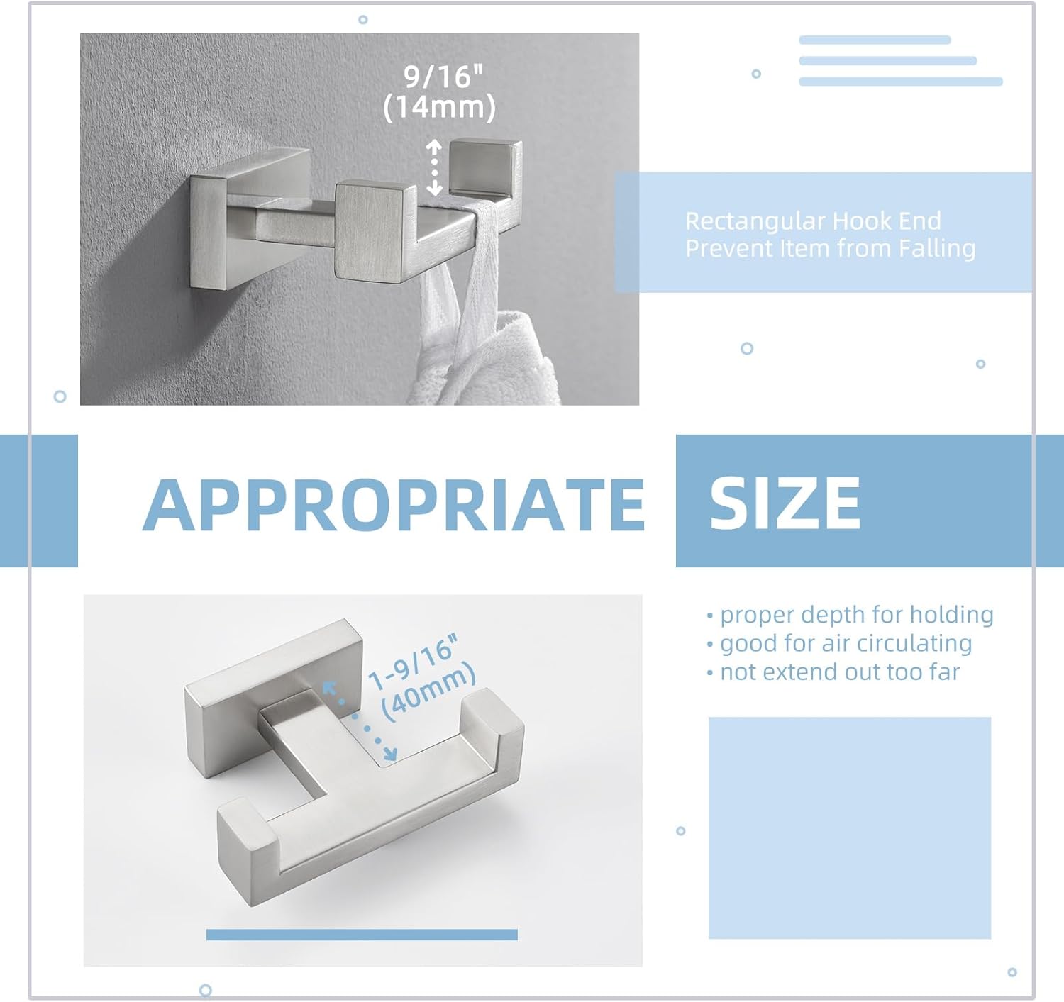 - EASY USE & BETTER DRYING: wide and right-angled hooks for ease of hanging up towels, distance between the hooks is 2-15/16"(75mm), allows enough air to dry out damp towels.
