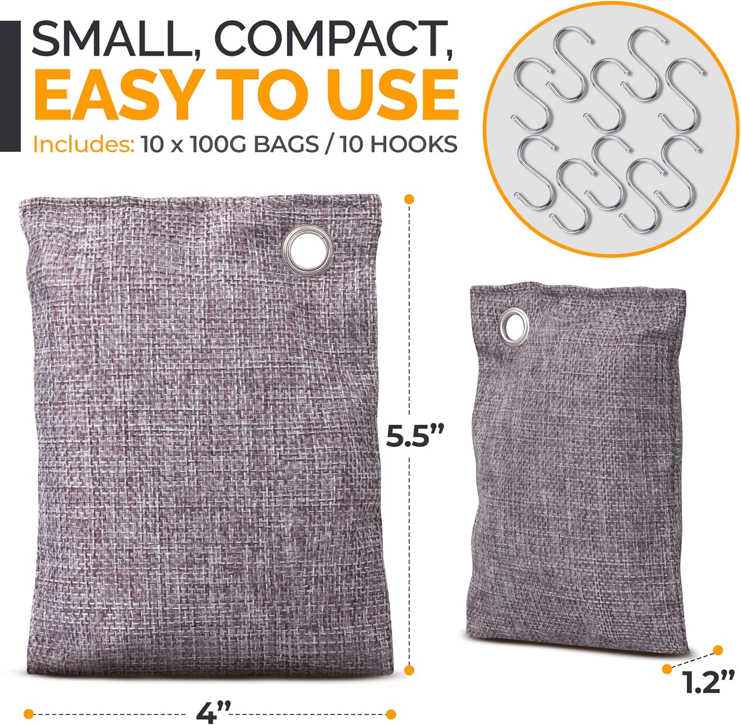- 10 CHARCOAL DEODORIZER BAGS WITH HOOKS. Our 3.5oz bamboo charcoal bag musty smell eliminators are the perfect size to place wherever you have a bad smell: closet, car, shoes, gym bag, basement, pet areas.