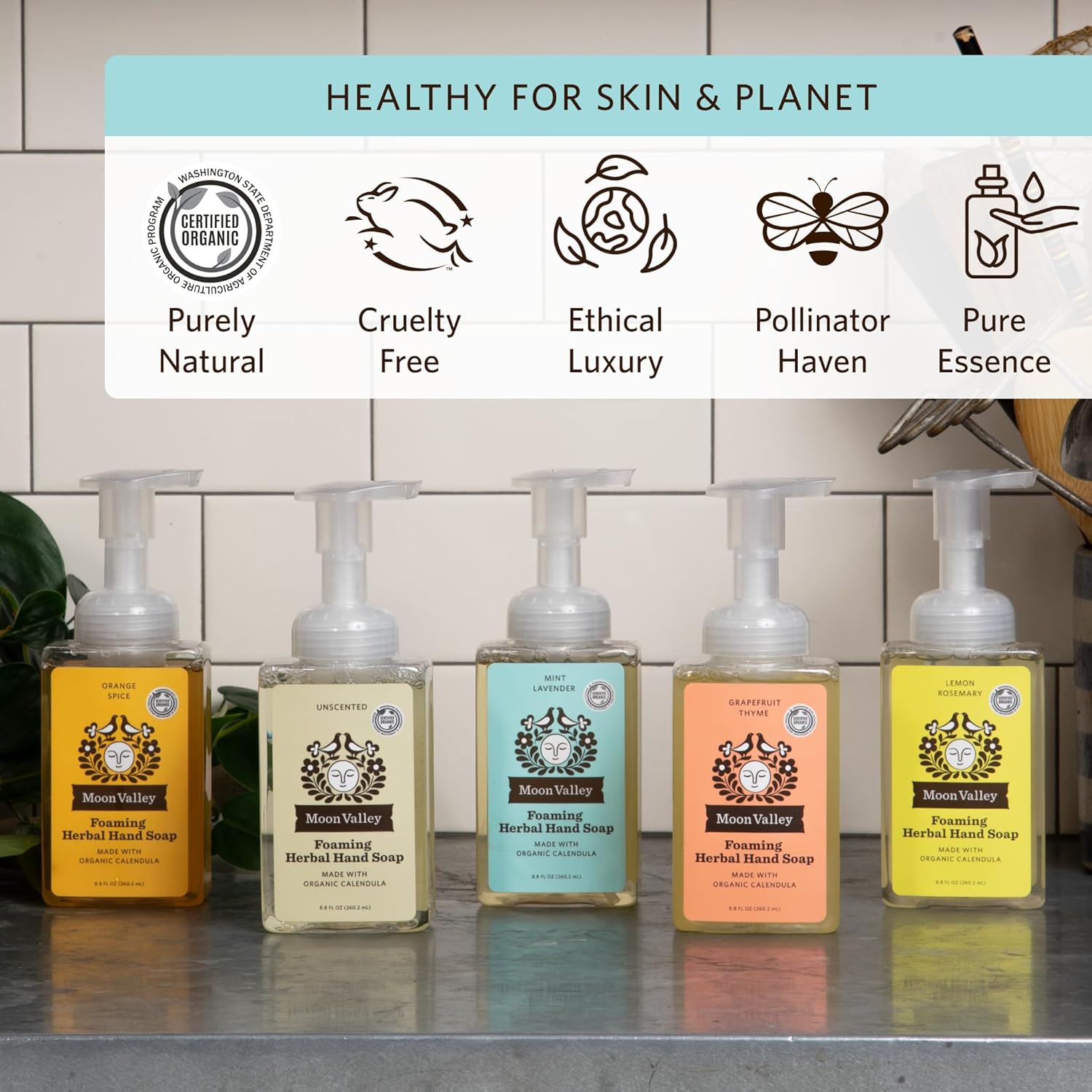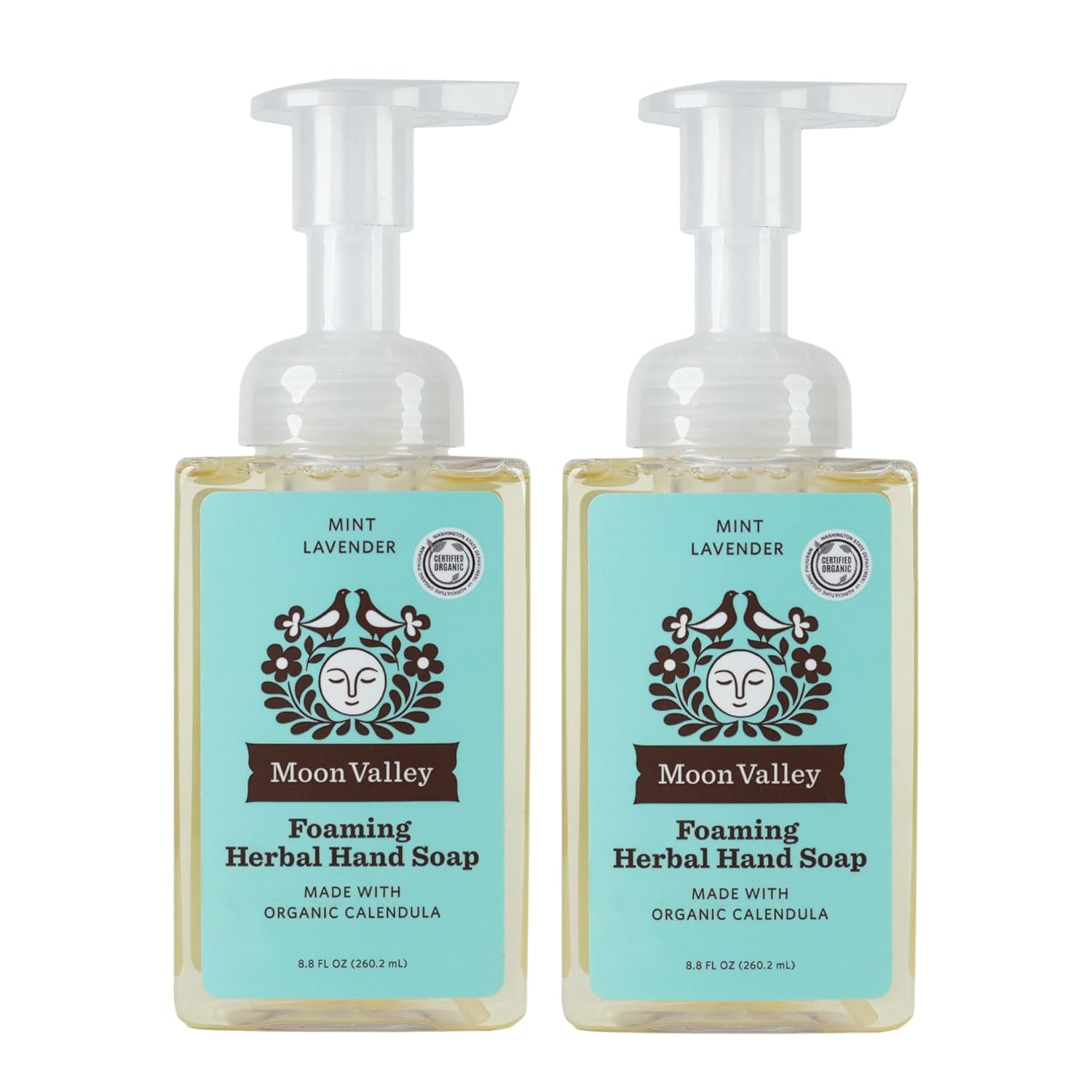 - TWO-PACK: This bundle of two 8.8oz Foaming Hand Soaps includes fresh and natural scents of Mint Lavender. Moon Valley Herbal Foaming Hand Soaps are vegan and non-gmo. Each bottle is recyclable. Ingredients leave hands soft and moisturized.