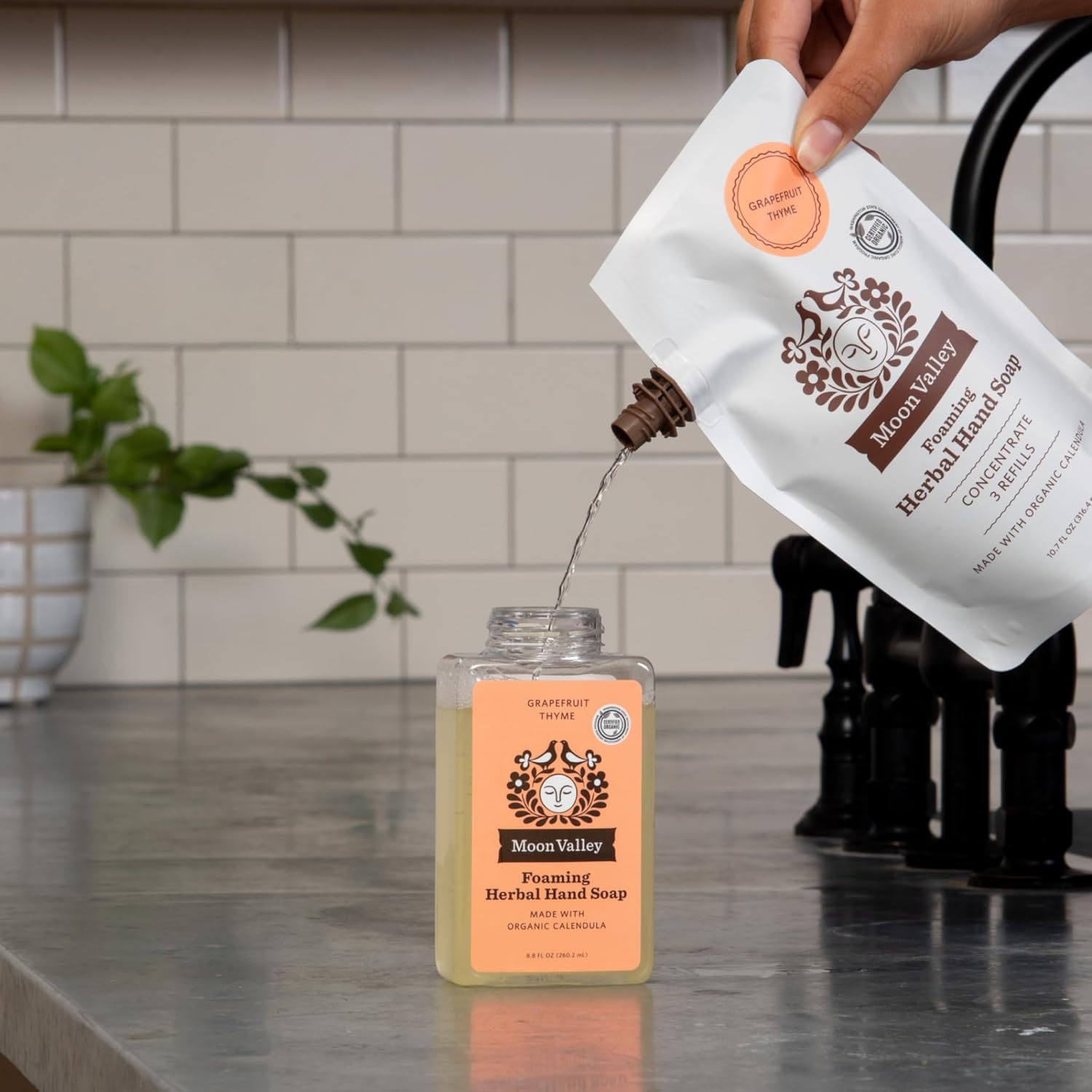 - REFILL PACK: This is a bundle of three 10.7oz Refill Pouches for Moon Valley foaming hand soap dispensers. Each pouch comes with enough concentrate to refill a standard recyclable dispenser three times. Unlike liquid soap, this concentrate is formulated for foaming dispensers.