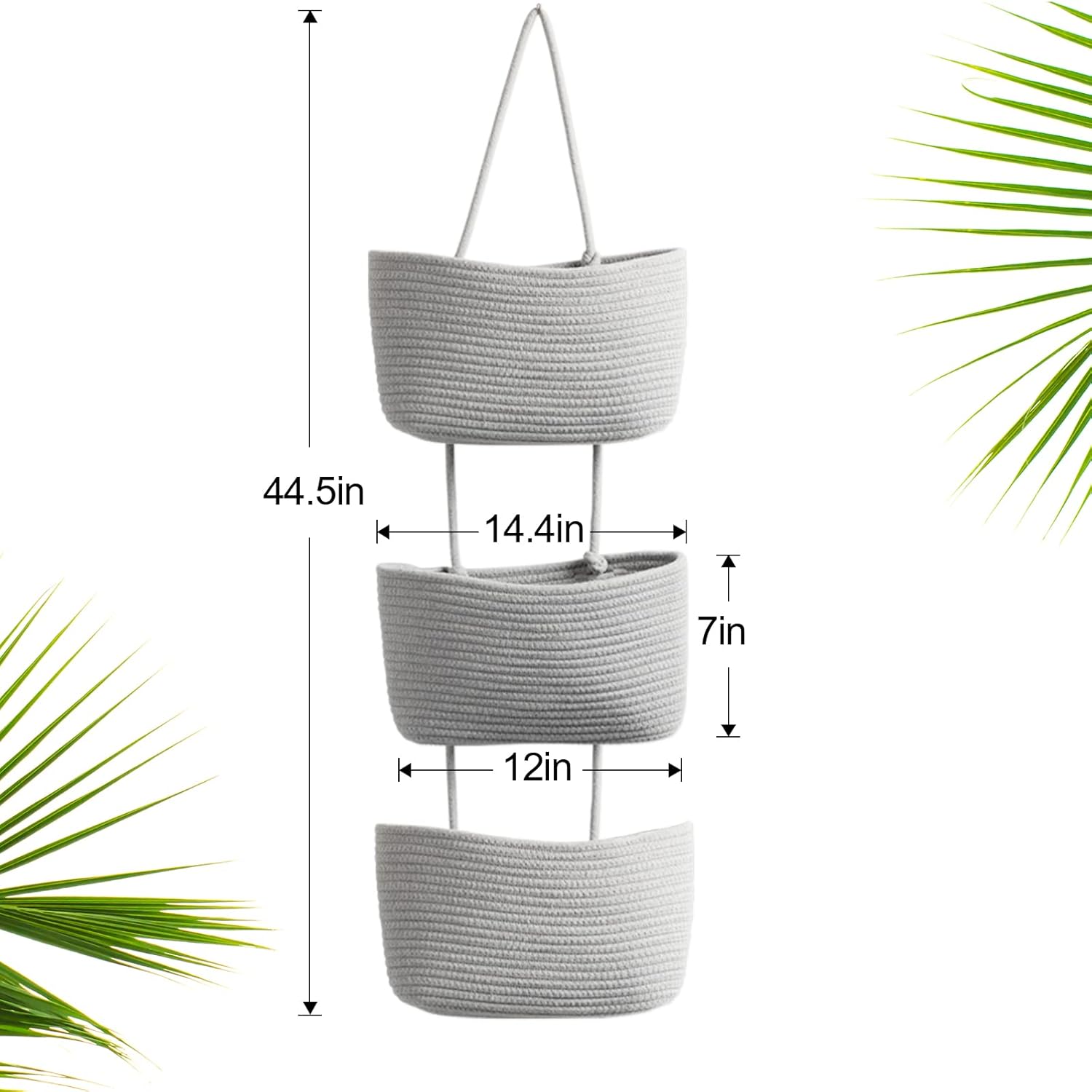 - Large Capacity: The whole woven cotton hanging wall basket measures a total height of 44.5 inches, with each basket-top length: of 14.4 inches; One over-the-door hook and three sticky hooks are prepared for you to hang up the basket