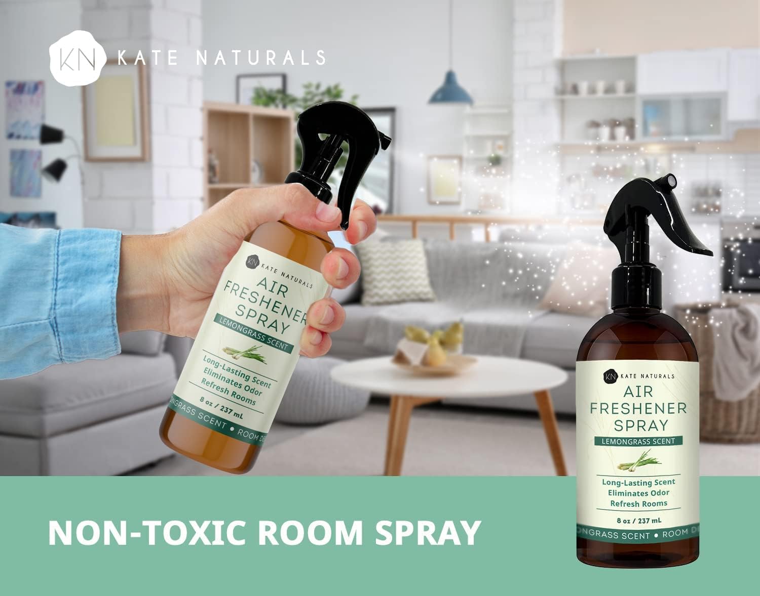 Kate Naturals Air Freshener Spray for Home. Lemongrass Essential Oil Odor Eliminator Room Freshener Spray for Pillows, Bedding, Linen (8 fl oz, Pet Safe, Non-Toxic)