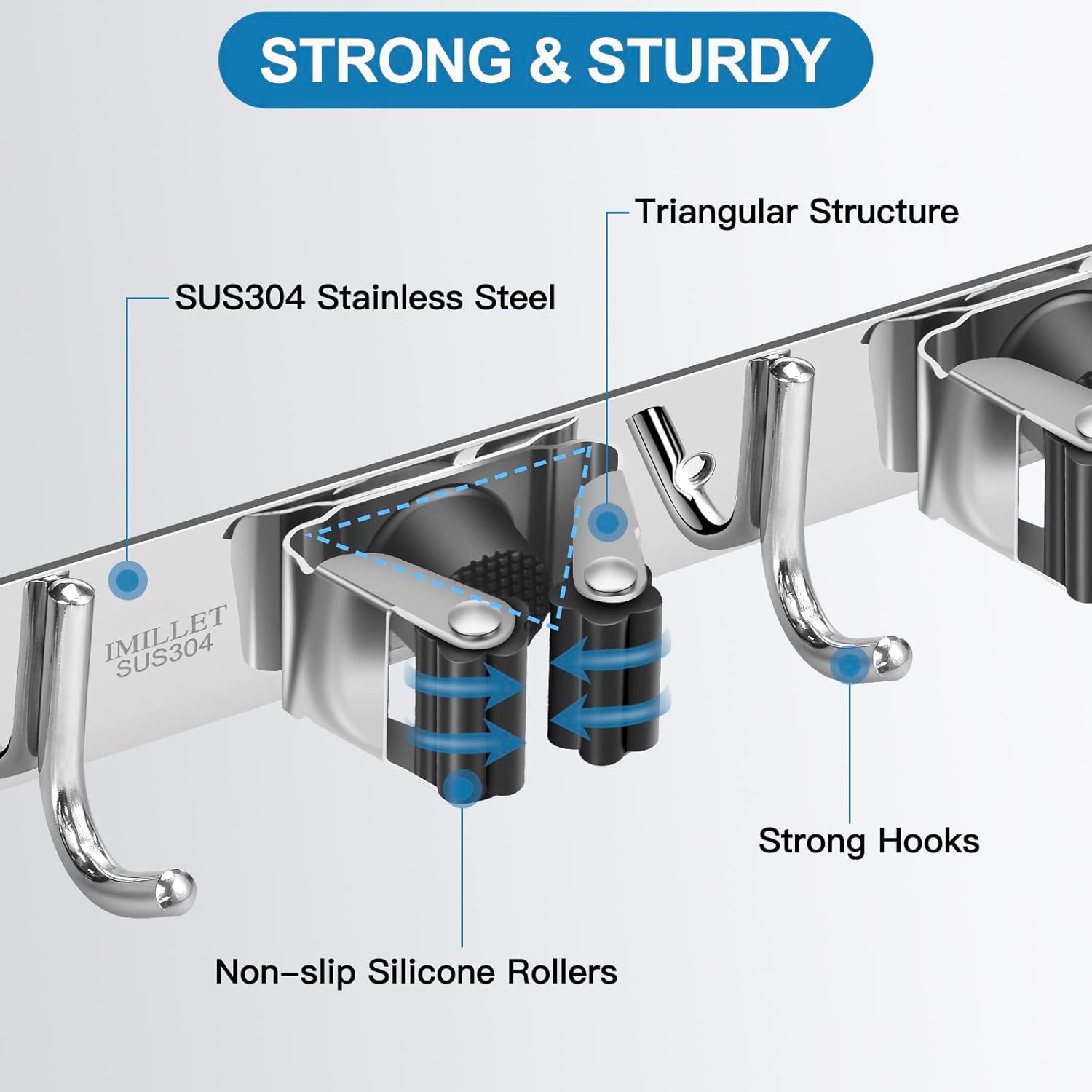 - STRONG & STURDY: Broom organizer wall mount is made of 304 stainless steel, corrosion-resistant, moisture proof and waterproof. Compared with the plastic broom rack, it's more stronger and sturdy. And this broom hanger wall mount can hold up to 200 pounds