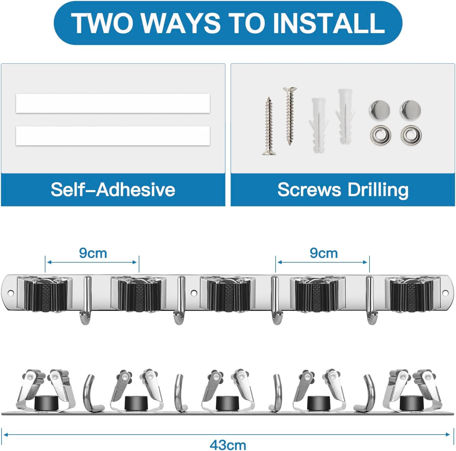- EASY TO USE and INSTALL: You can push the broom in and remove it with one hand.Different from plastic holder with the spring loaded rollers, this mop broom holder has the rubber rollers to hold the handles and allows for the handle to slide in from the front and is held tight in place.Never worry about that it will hurt your hand.And there are two ways to install, screws drilling and no drill