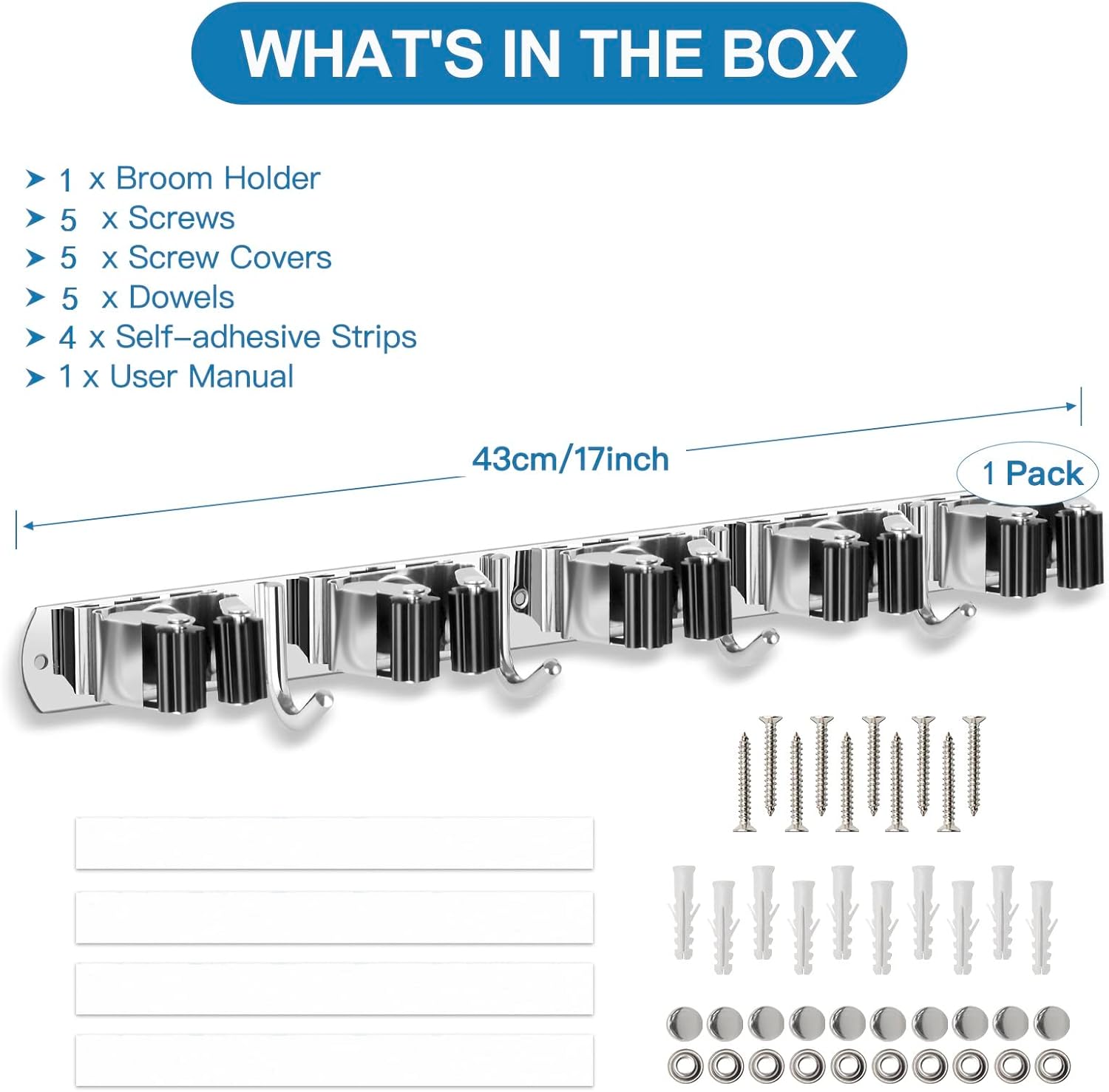 - 2020 UPGRADE: The size of broom holder is 17"*1.4"*0.08". The installation hole distance is based on standard 16" spacing for stud placement. 4 mounting holes and screw set make the mop holder is more sturdy on the wall.Includeing anchors fit most of all kind of walls