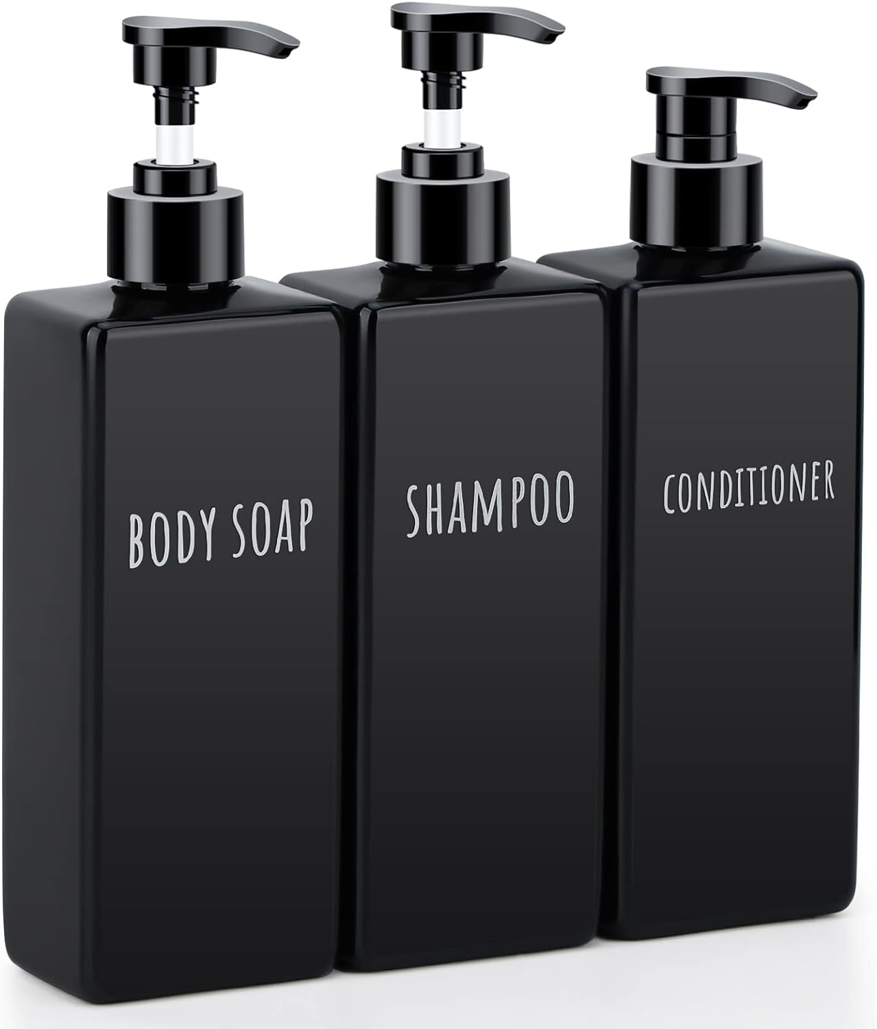 Segbeauty Plastic Square Soap Dispenser Black, 3pcs 16.9oz Refillable Shampoo and Conditioner Bottles, 500ml Empty Reusable Pump Bottle Bathroom Shower Dispenser Set for Body Wash Liquid Gel Lotion