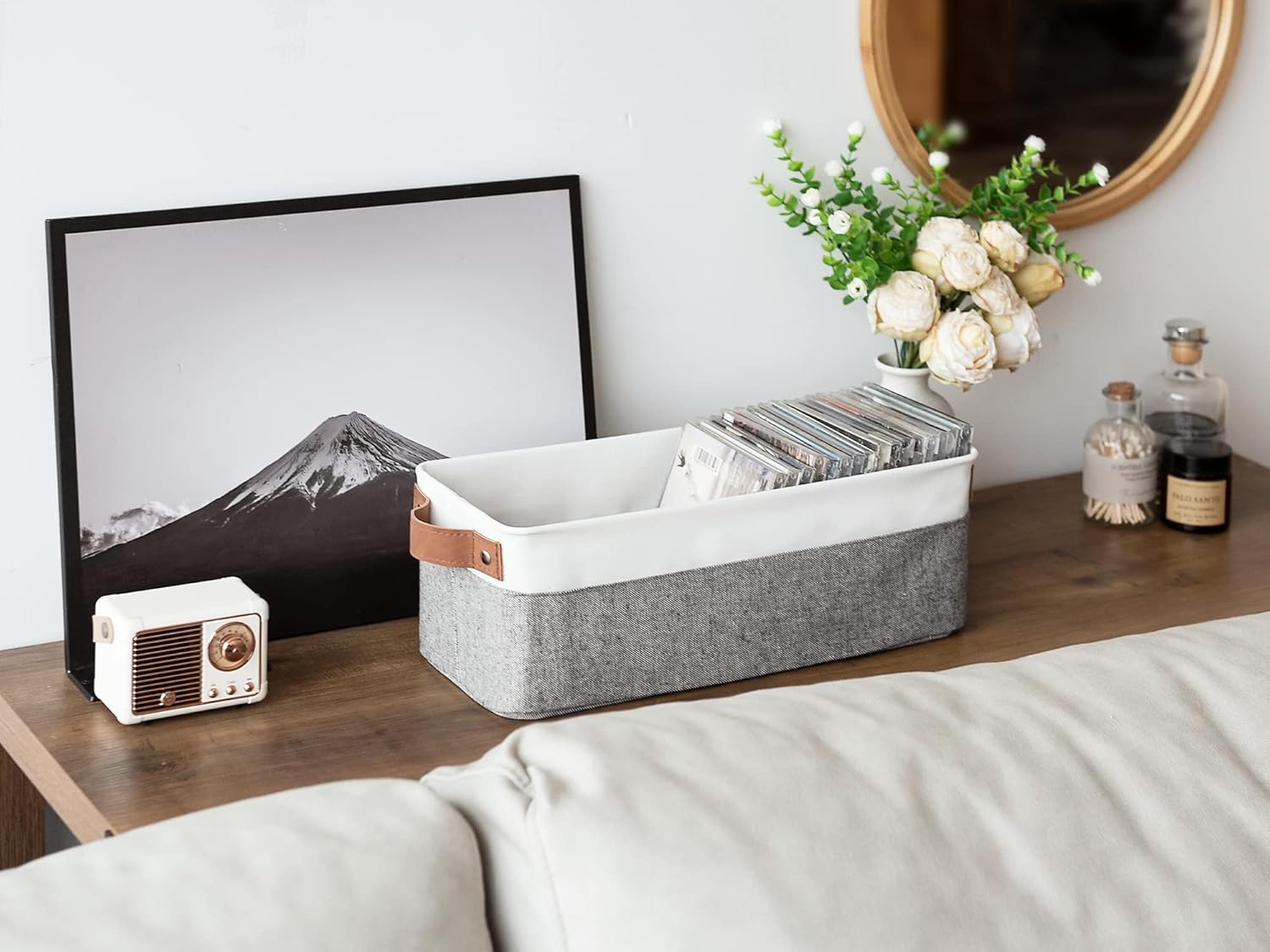 - The sleek modern design with 2 widened sewn-in handles makes this small basket a great addition to any home.