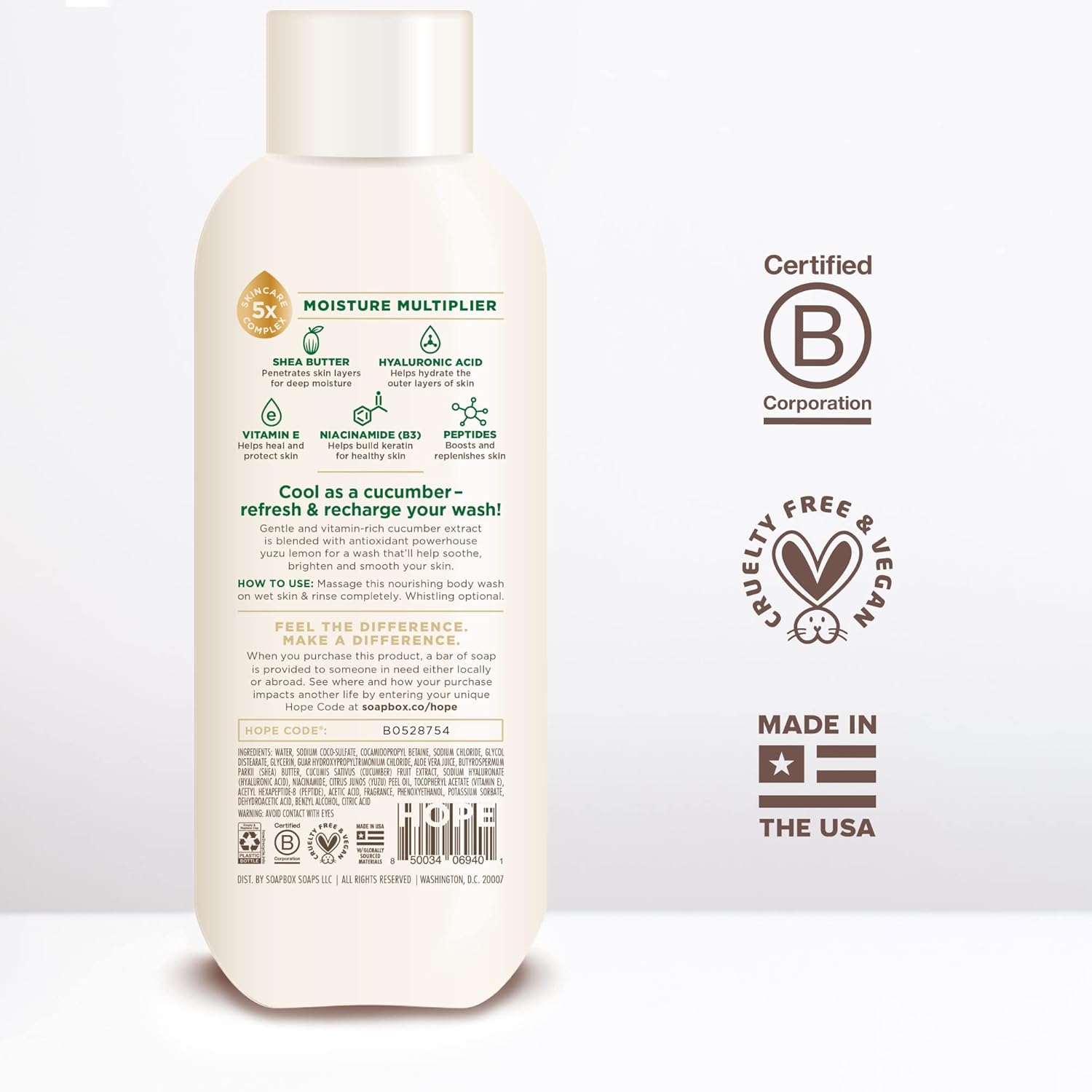Soapbox Cucumber + Yuzu Lemon Body Wash for Women, Men, Vegan + Antioxidant Rich, Soothing, Moisturizing Soap with Shea Butter, Peptides & Keratin Promoting B3, 3 Pack, 20oz Each