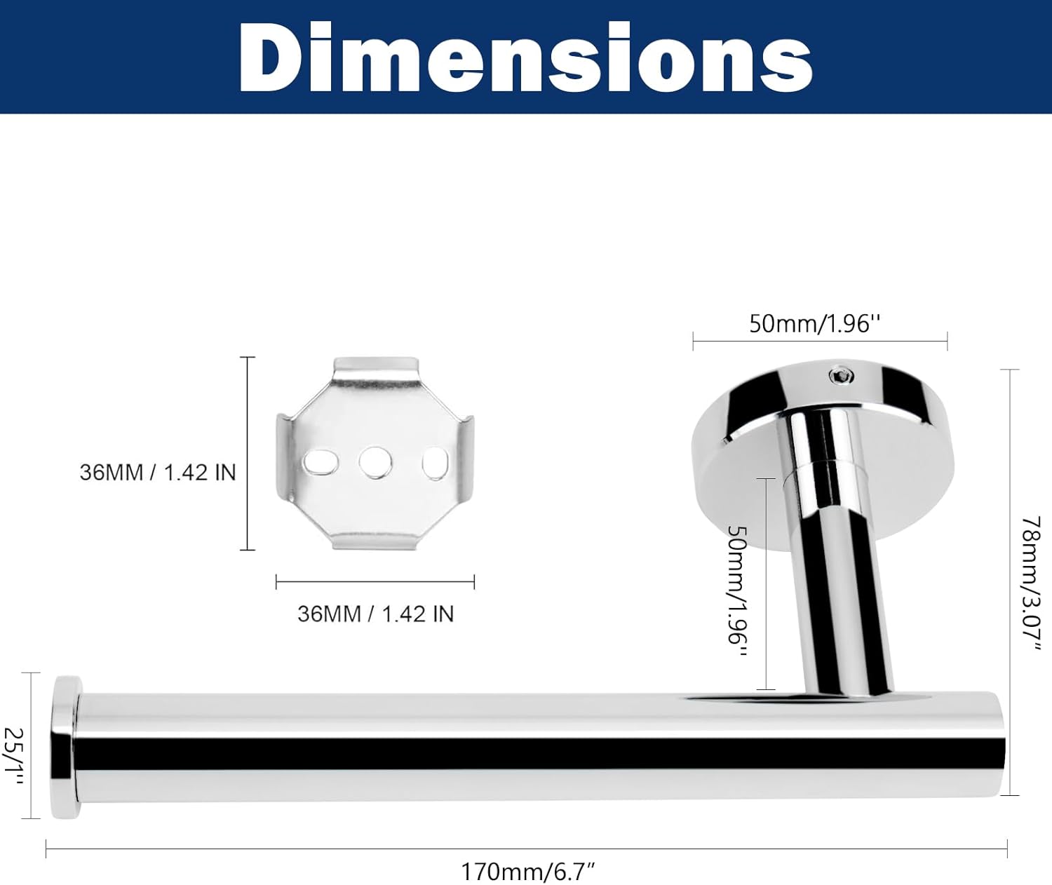 - WIDELY USE & SIZE: Length of the paper holder is 6-inch. And the distance to the wall is 3-Inch. Large enough to fit large rolls of toilet paper. One arm style doesn't limited Installation direction, can choose to mount it left, right, or vertically everywhere. It can also hang kitchen paper and small towels.