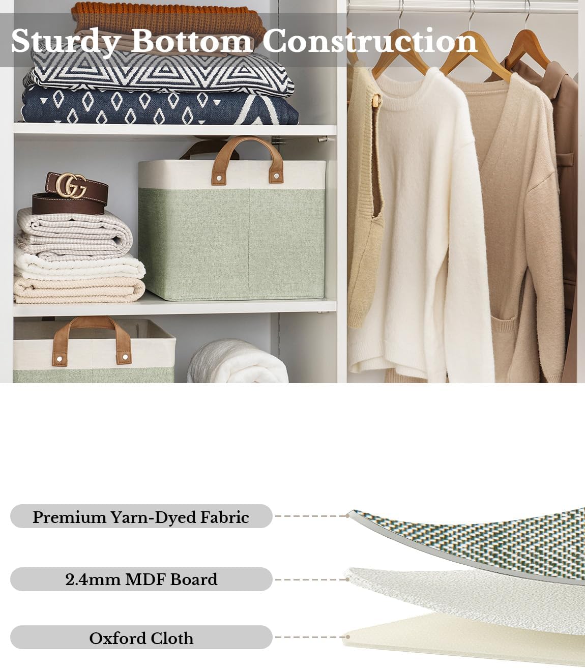 - Premium Quality: Made from high-quality fabric and reinforced with a heavy-duty MDF bottom board and a sturdy metal frame. The solid construction enables the storage bins to stand upright without support, even when empty.