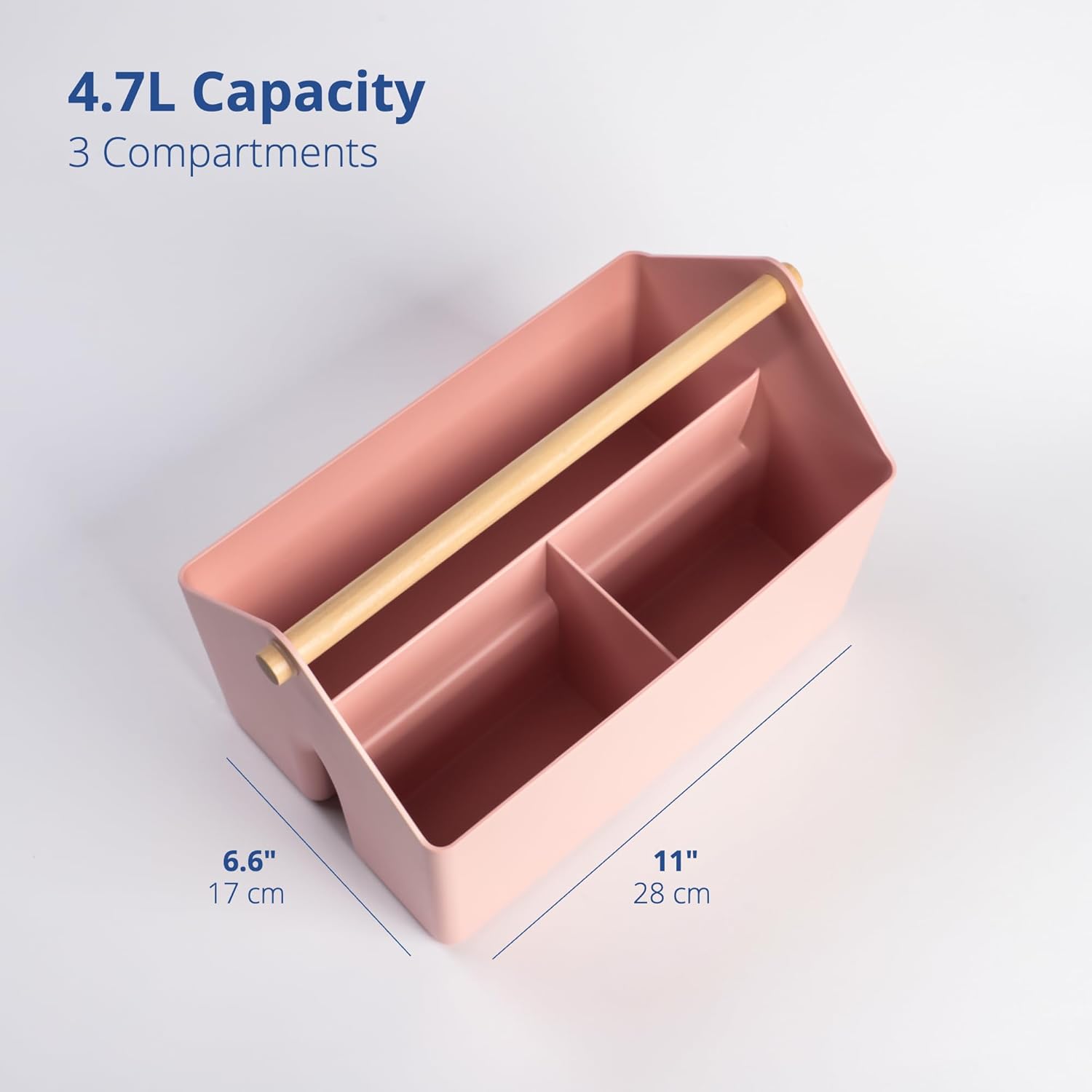 BLUE GINKGO Medium Storage Basket – Plastic Caddy with Wooden Handle for Office, Arts & Crafts, or Home Supplies (Pink)