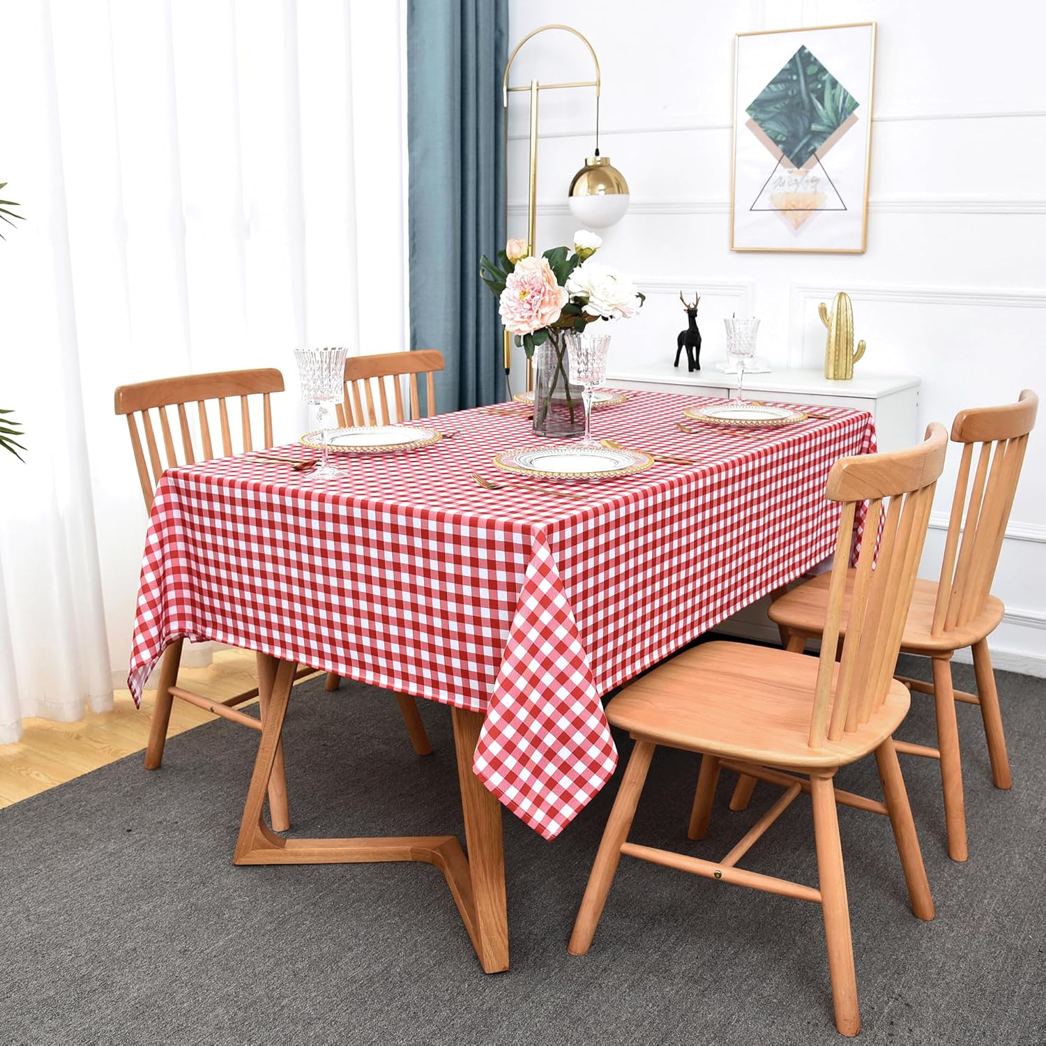 - CLASSIC GINGHAM CHECKERED DESIGN: Our checked tablecloth features a pattern of small, evenly spaced checks in two contrasting colors, often white and another color. The classic gingham plaid pattern for table cloth is a timeless and versatile choice