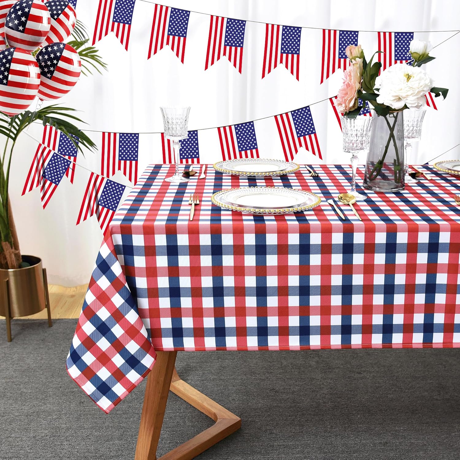 Classic Gingham 4th of July Tablecloth Fabric - Oblong 58x144 Inch Patriotic Party Table Cloth for Indoor Outdoor - American Theme Table Cover for Picnics and Parties