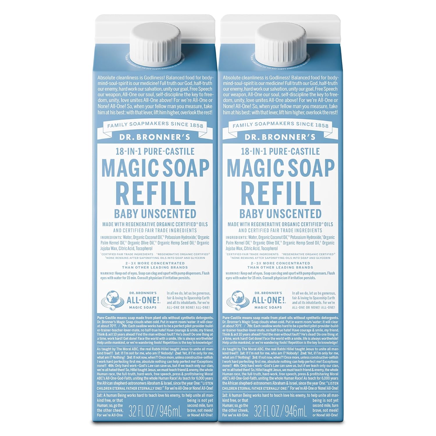 Dr. Bronner's Magic Soap-Pure-Castile Liquid Refill (Baby Unscented, 32 ounce, 2-Pack) - Made with Regenerative Organic Certified Oils, For Body, Hair, Laundry, Pets & Dishes, Concentrated, Vegan