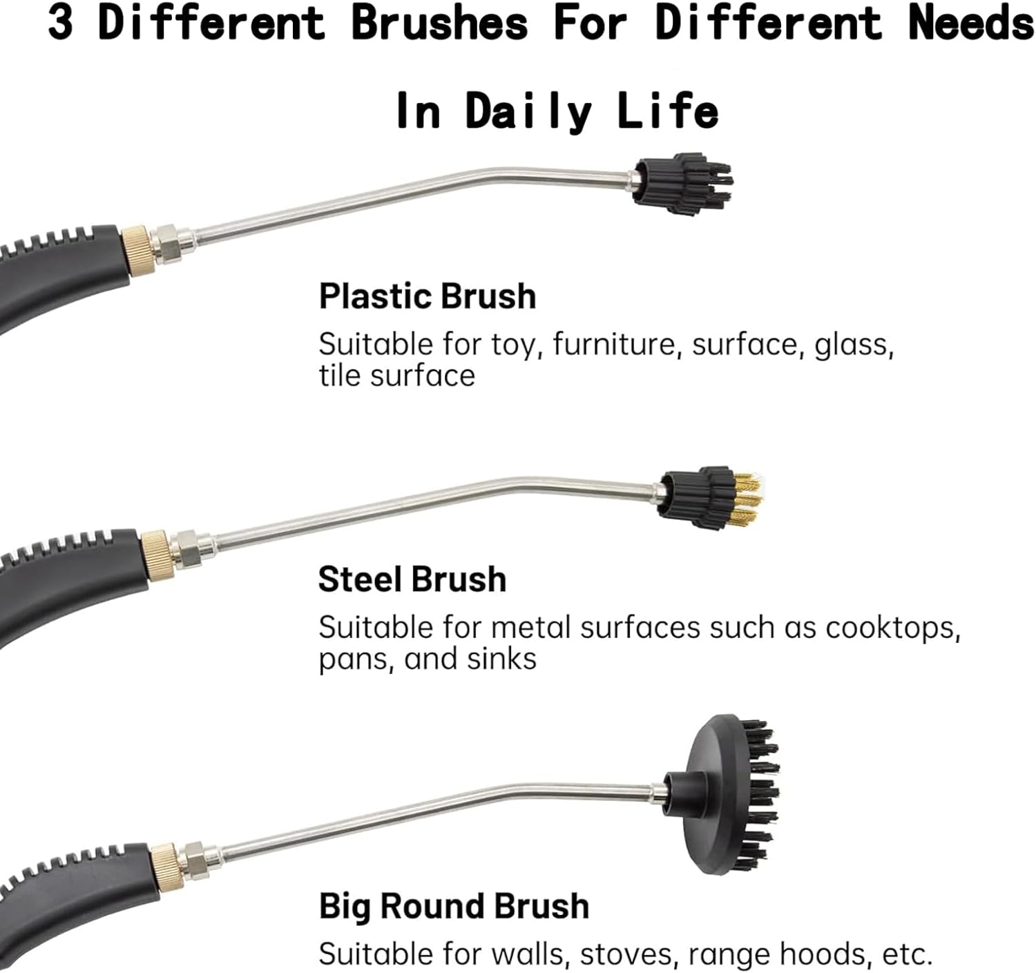 - 【6 Speeds & 3 Different Brush Heads】You'll get 3 different varieties - steel brush, plastic brush and big plastic brush that you can choose different brushes according to the cleaning object. Also, the handheld steamer comes with a 2.2m steam pipe and extension tube, which can deeply clean the hard-to-reach areas like crevices and corners and tight spaces saving your labor.