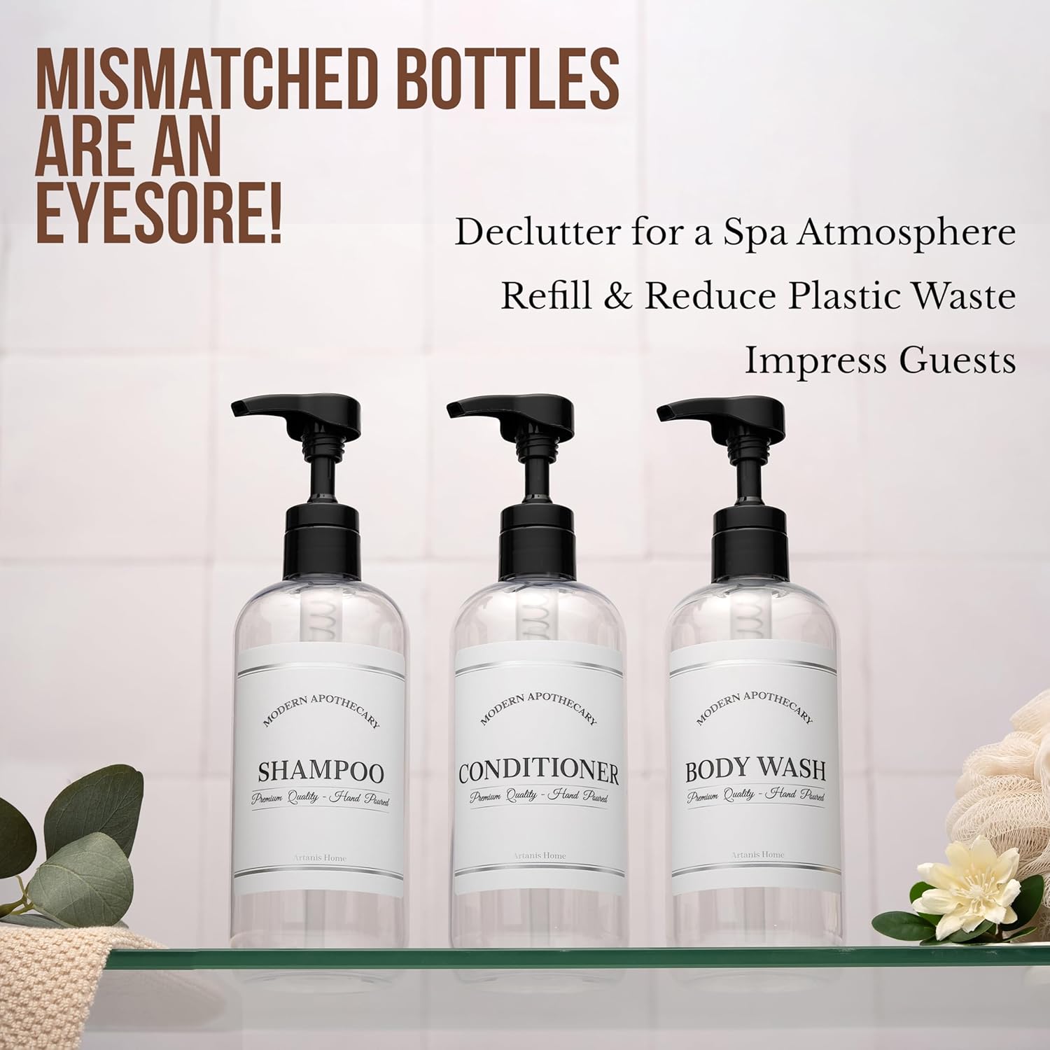 - Bring Style To Your Bathroom: Revel in the luxury of a well-organized shower. Refine your interior decor with these chic body wash, conditioner and shampoo dispenser bottles. Curate your whole home. Modern Apothecary bathroom bottles coordinate with additional matching titles for the sink, kitchen, office, and rentals. Classy, with a touch of retro flair