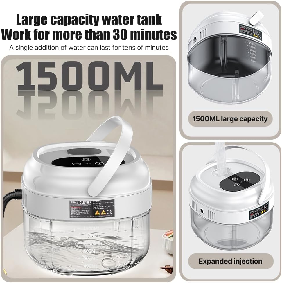 - Large Capacity: Portable steam cleaner with a large water tank of 1500ml capacity and large water inlet which allows you to focus on cleaning, instead of refilling often.