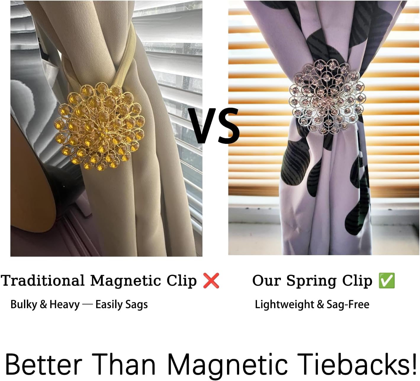 - 【Flexible Spring Wire Design】 Unlike magnetic tiebacks, these flower curtain tiebacks use a stainless steel spring wire that stretches easily to wrap around curtains — no drilling or tools required.