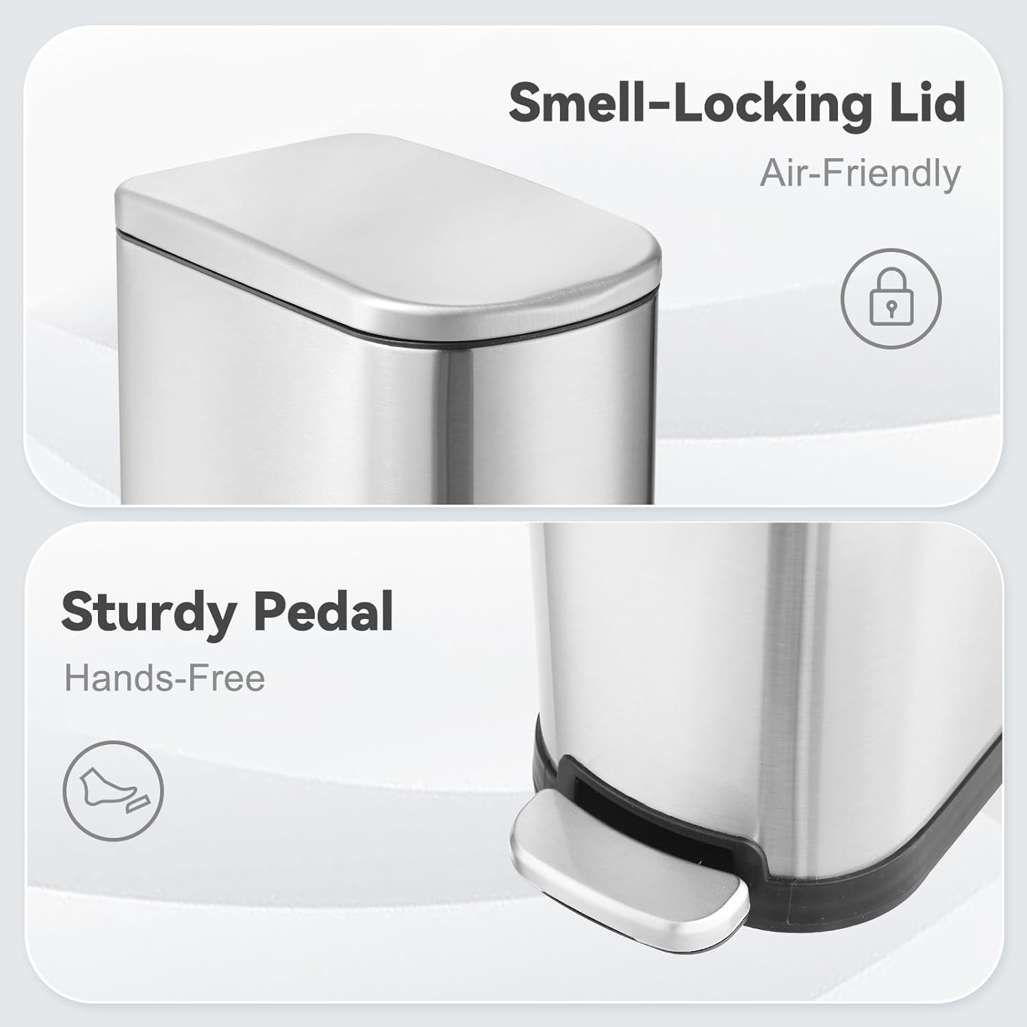 - Quiet Soft-Close Lid: Say goodbye to noisy trash cans! Our soft-close lid closes gently and silently, reducing disruption in your home or workspace. Whether you're disposing of waste late at night or in shared spaces, this feature helps maintain peace and quiet while keeping the lid in excellent working condition for long-term use