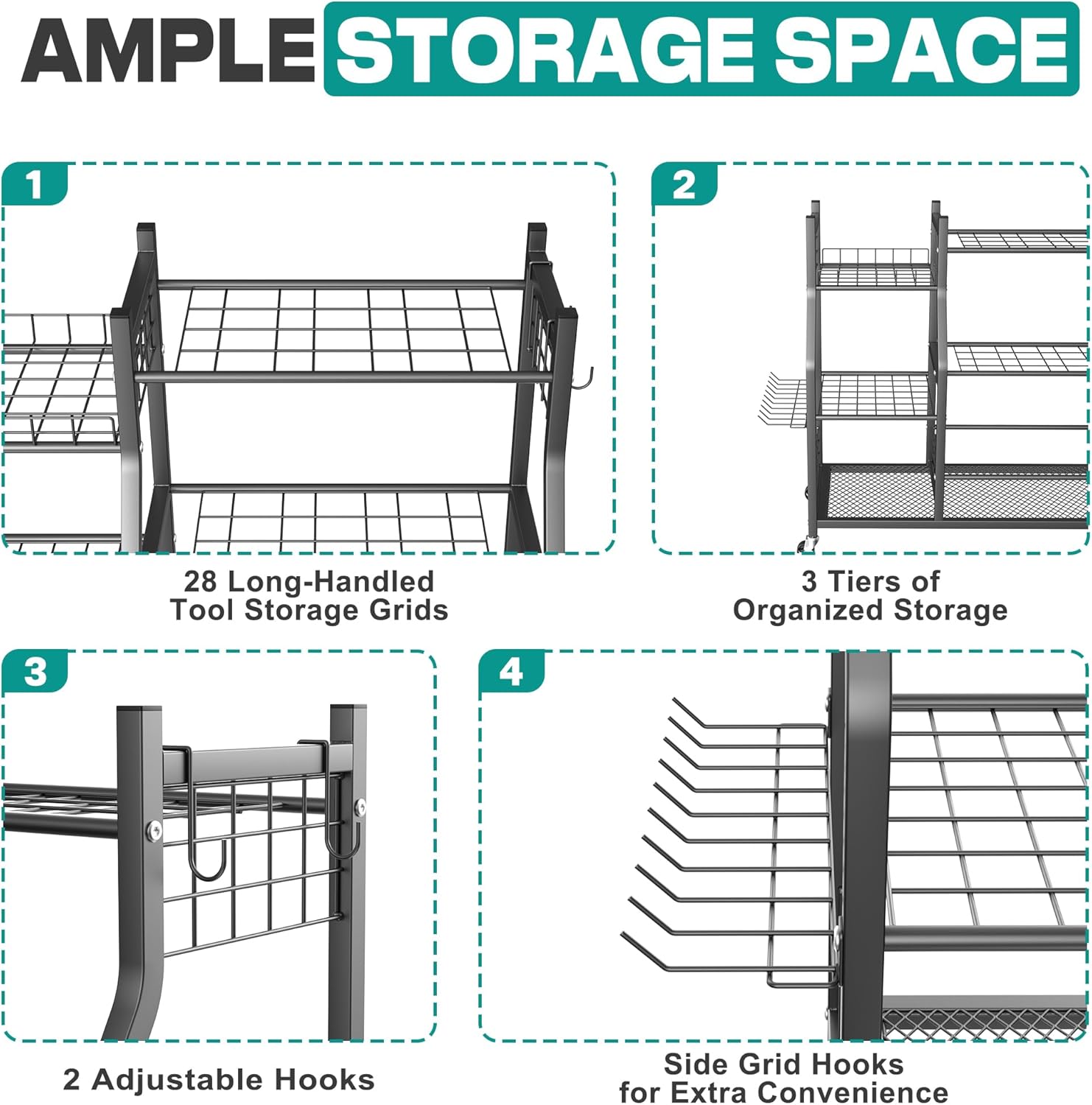 EVERHANGER Garden Tool Organizer Stand, Garage Tool Storage Organization, Yard Tool Racks with lockable wheels, Fit for Long-Handled Tools/Rakes/Brooms