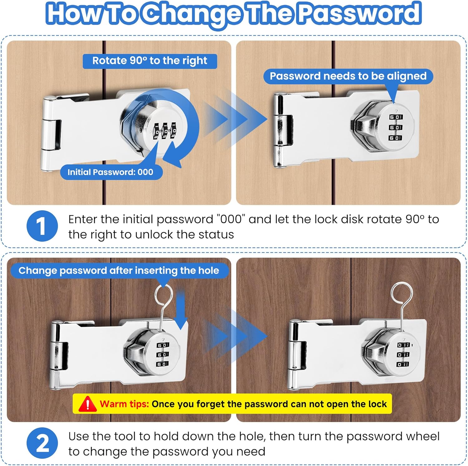 - Complete Set: The set includes a thickened 4.5-inch cabinet password hasp lock, a tube of adhesive, seven screws, a hole punch, and an instruction manual