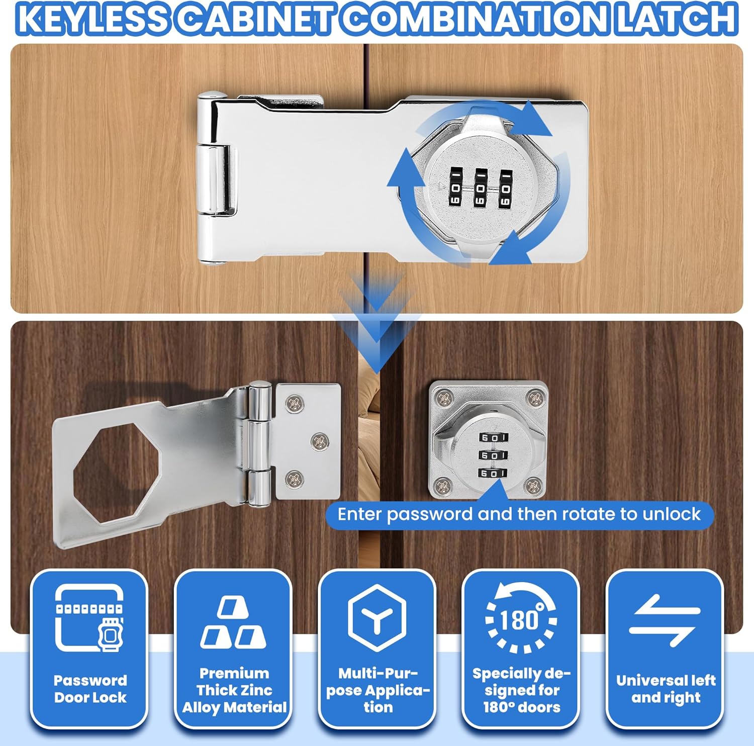 Keyless Cabinet Lock with Combination Code - 3-Digit Password Hasp Latch Lock for Drawers, Bifold Closet Door and Double Sided Door (Silver, 4.5 Inch)