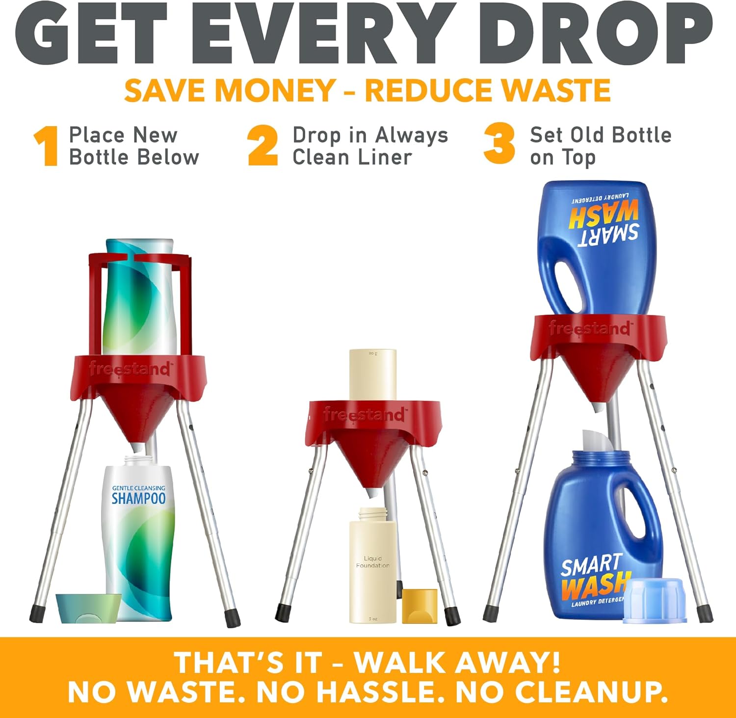- MAXIMIZE PRODUCT USE: Designed to help you get every last drop from your health, beauty and personal care products. Lotions, shampoos, conditioners, oils, body washes, perfumes, and more—Freestand easily reduces waste and ensures you’re getting the most out of every bottle, saving you money, frustration, and extending the life of your favorite products.