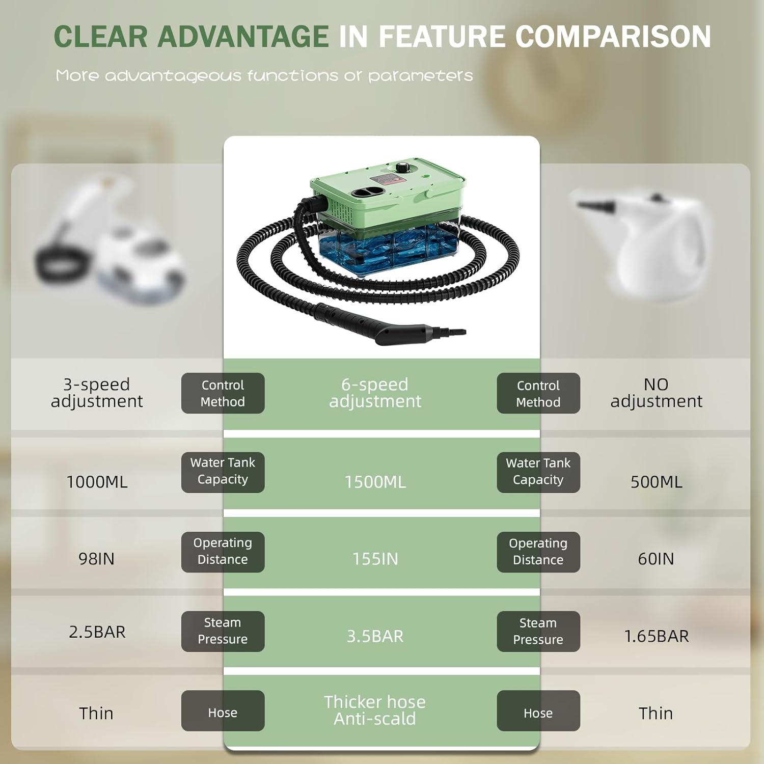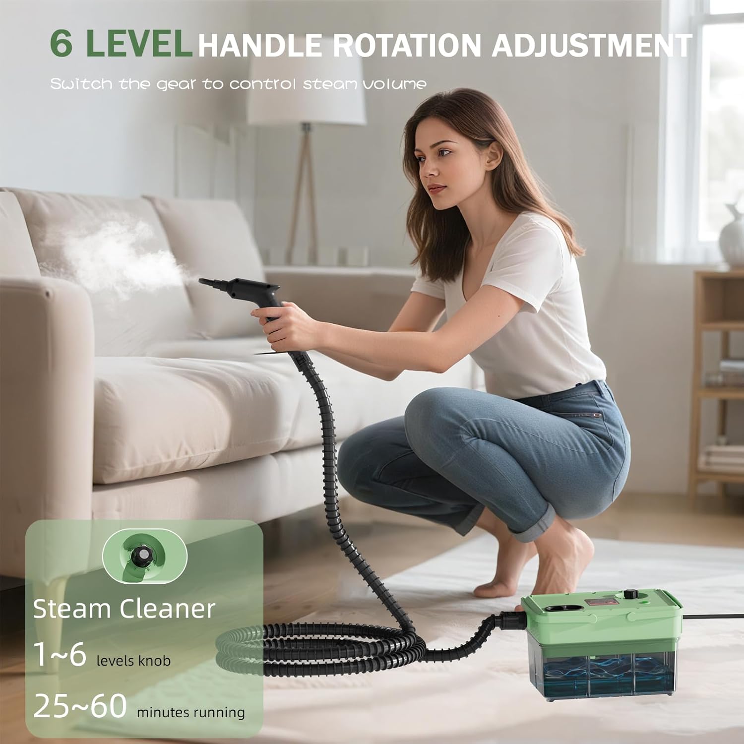 • 6 Adjustable Steam Levels: Customize your clean with 6 precision steam settings!This flexibility ensures you get the perfect steam output for your specific cleaning needs.Use low steam for delicate surfaces (e.g., curtains,car seats) and high pressure for tough jobs (e.g., greasy stoves,bathroom grout).The ergonomic grip make operation effortless.