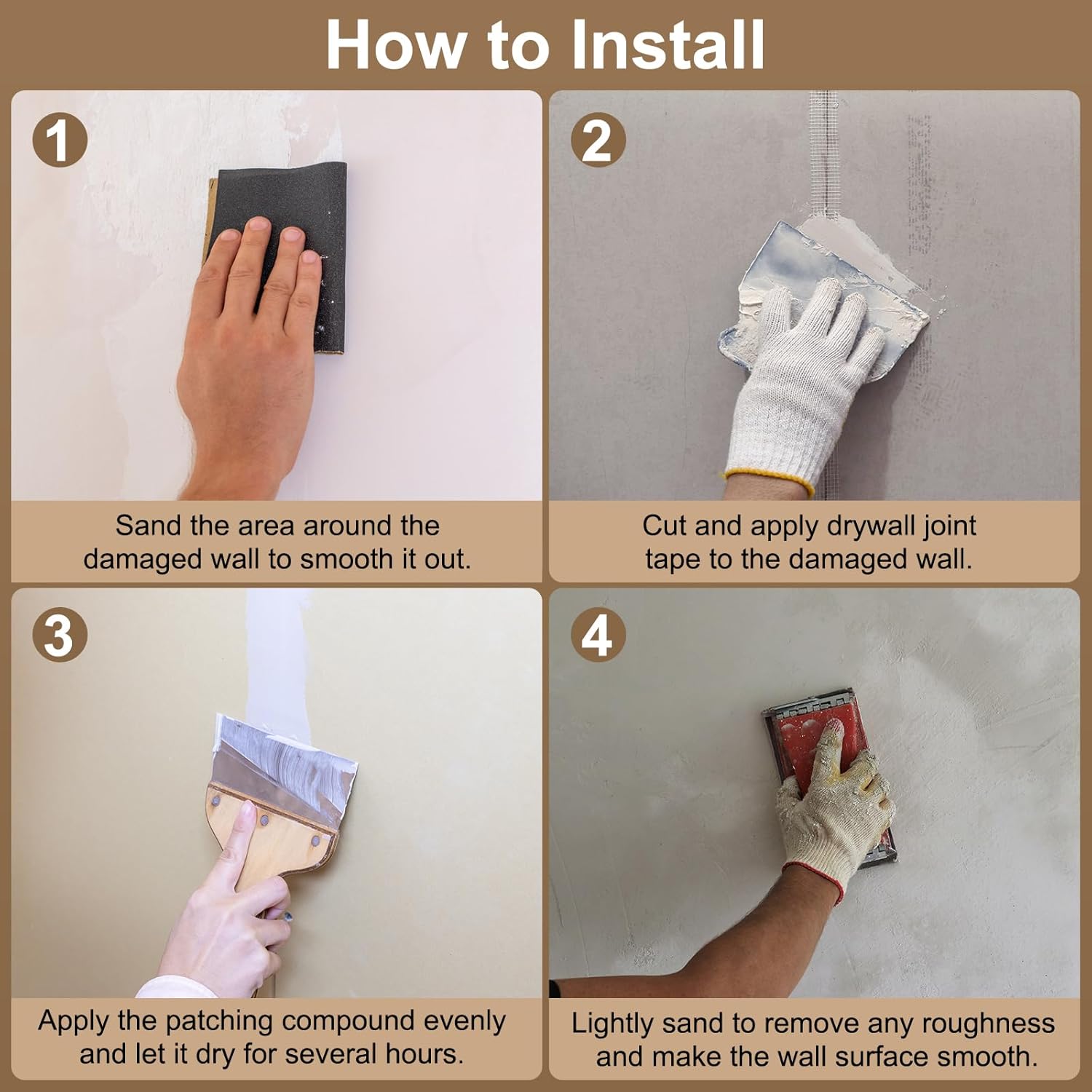 - Instruction - 1. Sand the area around the damaged wall to smooth it out. 2. Cut and apply drywall joint tape to the damaged wall. 3. Apply the patching compound evenly and let it dry for several hours. 4. Lightly sand to remove any roughness and make the wall surface smooth.
