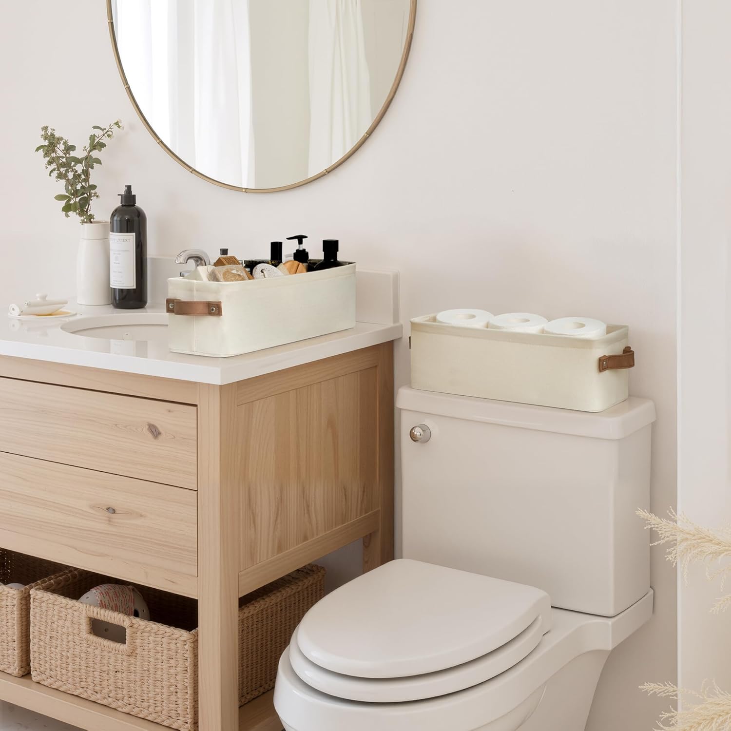 - The sleek modern design with 2 widened sewn-in handles makes this small basket a great addition to any home.