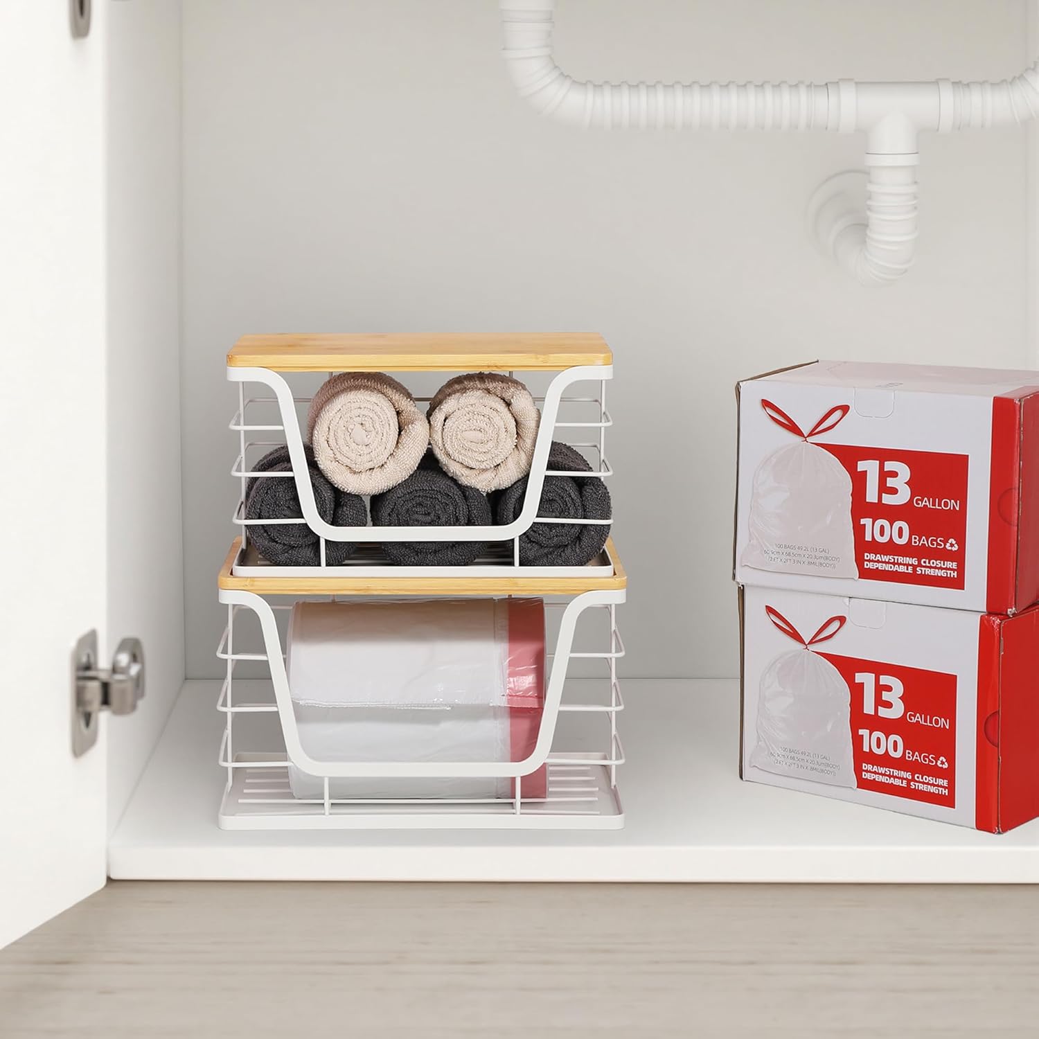 - 2 Different Sizes Combinations, Stackable: The extra large trash bag dispenser (11.18 inches long) can store 13, 30, 33 gallon rolls, the large (10.55 inches long) can store 13, 30 gallon rolls. You can also use them for a fruit/ onion baskets to store fruits and veggies or pantry snacks. Please make sure whether the size is suitable for storing your roll of garbage bags