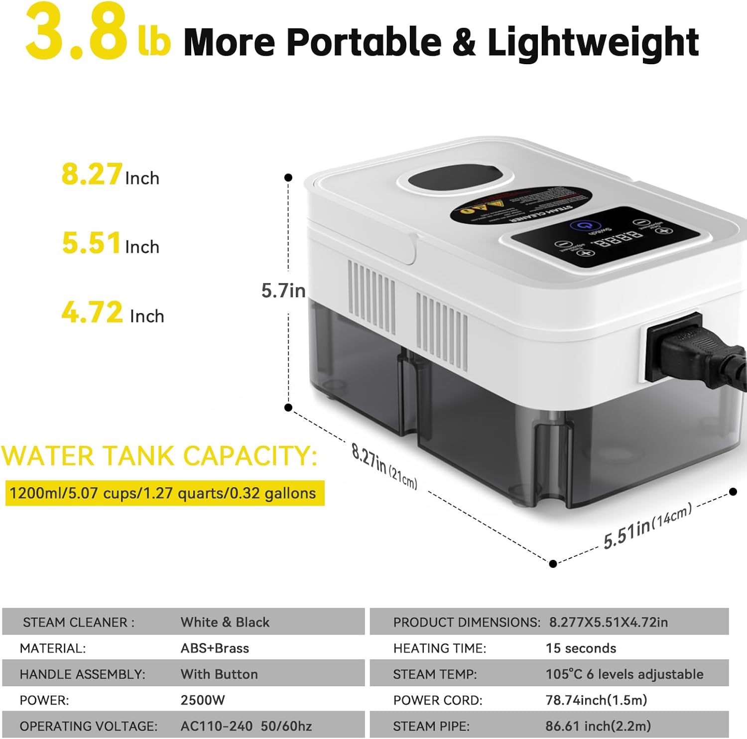 - 【Professional-Grade Steam Cleaner—Fast Heating with Smart Safety Features】 With 2500W of power, this steamer heats up in just 10 seconds and delivers high-pressure 221°F (105°C) steam to deep clean everything from floors to kitchen grease—no harsh chemicals needed. Set the built-in 30-minute timer for focused cleaning sessions, and don’t worry—it automatically shuts off if water runs low or time’s up