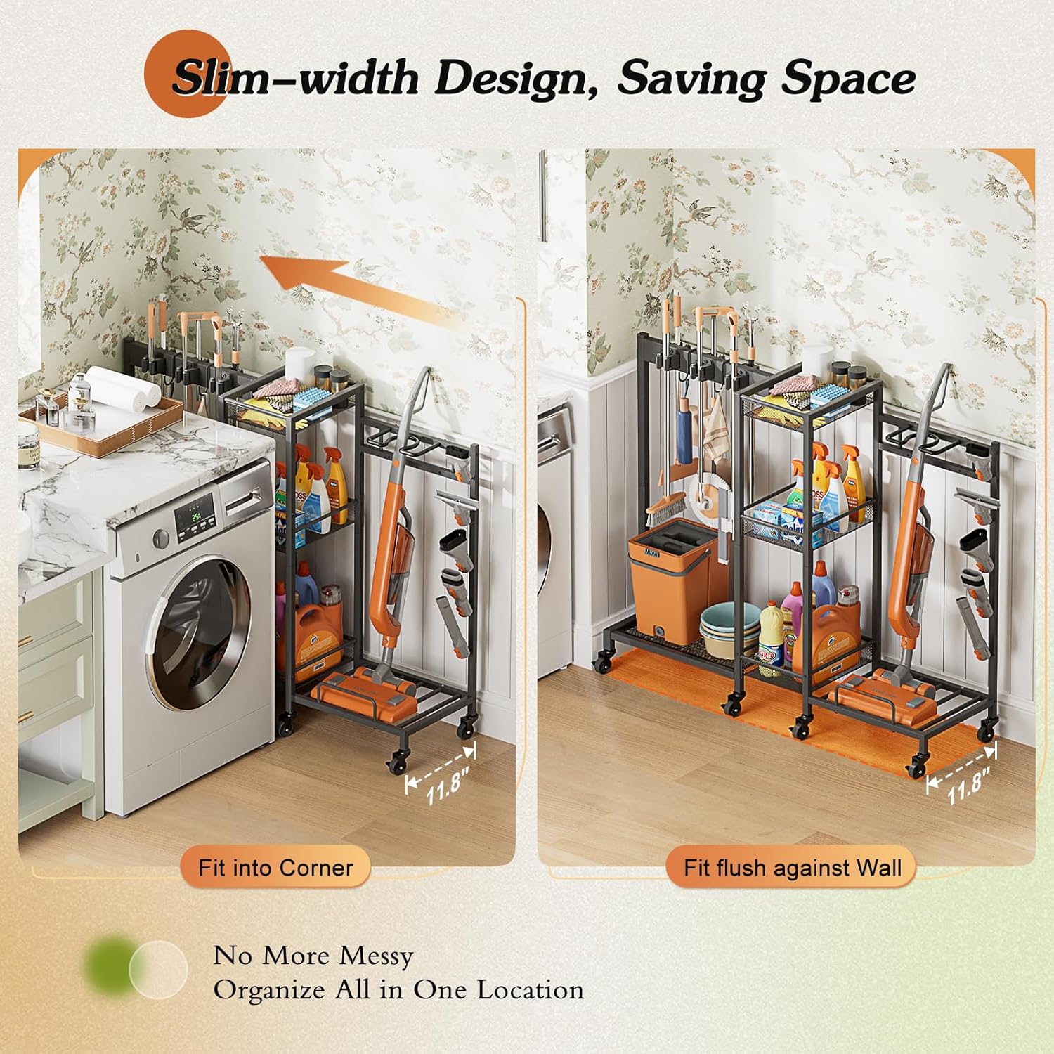 - 【Small Footprint Cleaning Supplies Organizer】Designed to save space without sacrificing storage, the slim-profile broom organizer fits perfectly in tight spots like laundry rooms, closets, kitchen, bathrooms, or corners. Its vertical layout keeps everything organized while taking up minimal floor space—ideal for small homes and apartments.