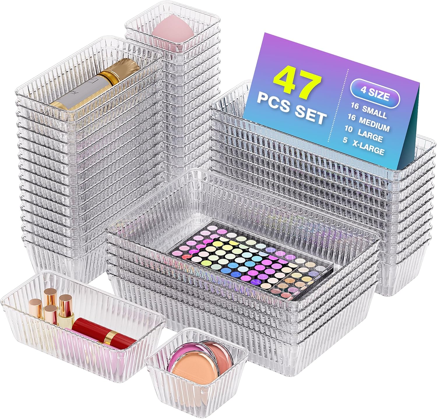 47 PCS Clear Plastic Drawer Organizer Set - 4 Sizes Makeup Organizer Desk Drawer Divider Bathroom Organizers and Storage Bins for Makeup, Jewelry, Gadgets, Office, Kitchen, Bedroom, Bathroom
