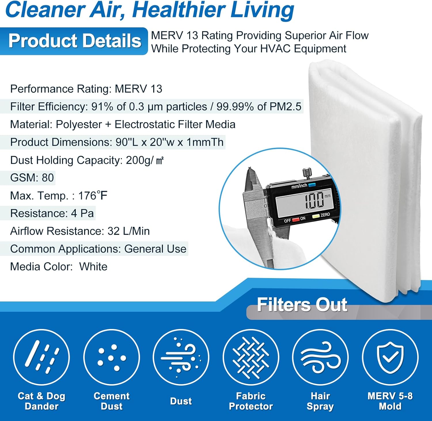UCINNOVATE MERV 13 Filter Media 20"x90", 12.5 Ft² Cut to Fit Electrostatic Air Vent Filters with 125" Tape, Stop Dust, Pollen and Pet Dander(0.3 Microns) for HVAC AC Vent Purifiers Fan Registers