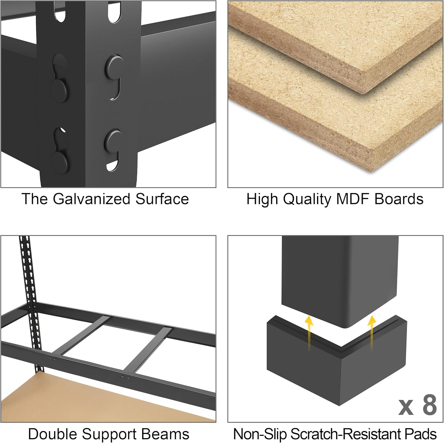 - γHEAVY DUTY & LONG-LASTINGγ : This 5-tier garage shelving is made of high-quality 0.23" thicker MDF boards and 0.04" thicker heavy duty galvanized metal frame, sturdy and enduring. The metal frame is covered with premium powder coating to give it a smooth surface. Each layer shelf add 2 middle support beam for more weight capacity. Each shelf holds up to 450 lbs, 5 tier shelves' total max load weight is 2250 lbs