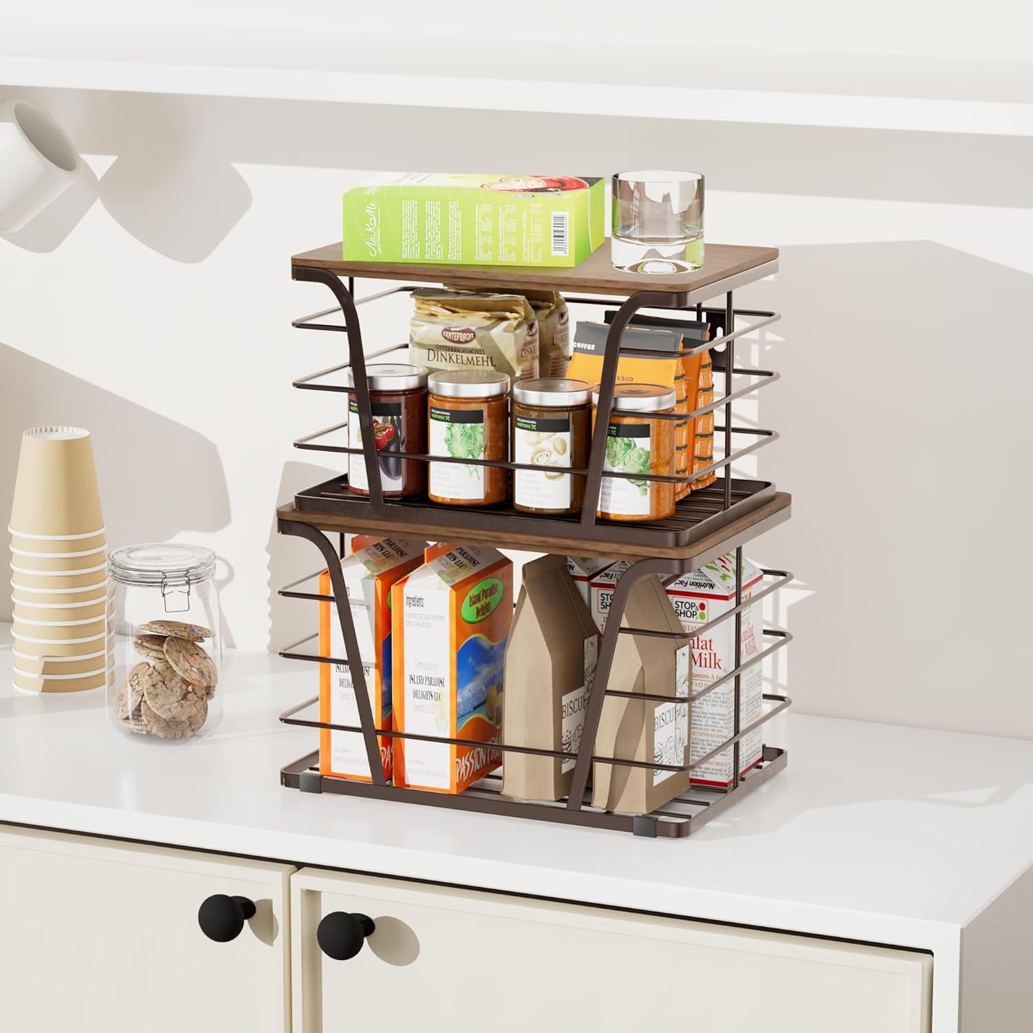 Extra Large 2 Pack Stackable Storage Pantry Organizers and Storage, Wall Mount Trash Bag Holder with Bamboo Top and Garbage Bag Dispenser, Brown